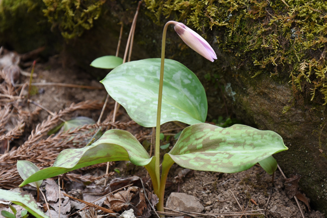 | 令和4年4月12日(火)の関川村のカタクリ 今年の春先は天候が不順で気温が上がらず、カタクリの開花が遅れました。 カタクリが漸く見頃を迎えた湯沢観音公園では、今年も白花のカタクリが咲いていました。 下の写真のように純白のカタクリは一株だけで、他の数株の白花には少々紫色が混じっていました。 関川村のカタクリの葉は、斑入りの個体が多いような気がしますが、 この純白のカタクリの葉には斑が入っていませんでした。 ![]() このカタクリにも斑が入っていませんでした。 ![]() |